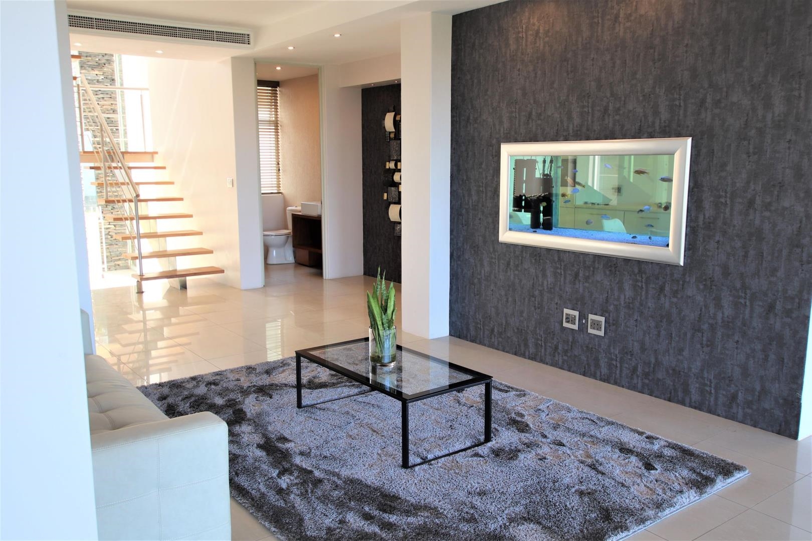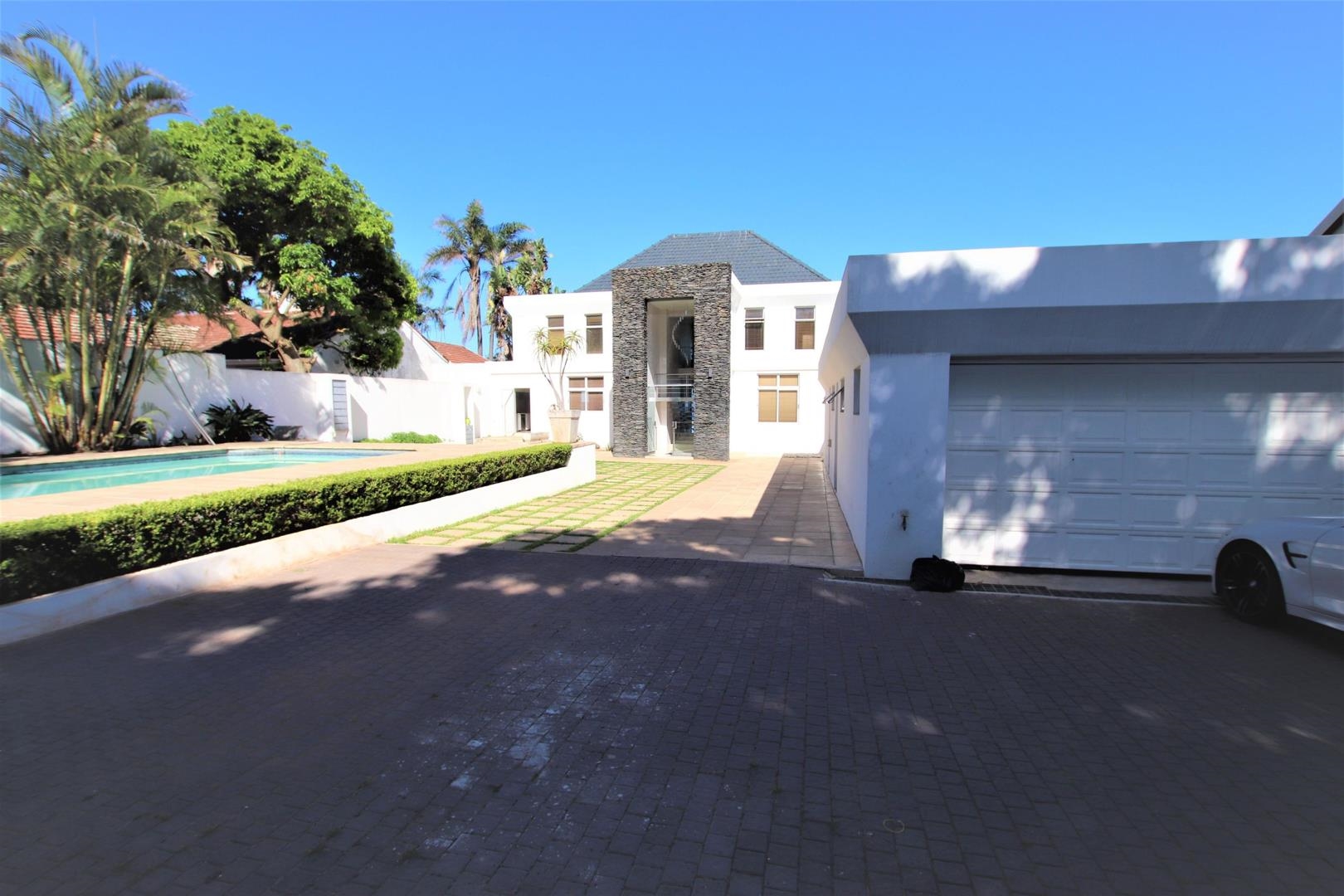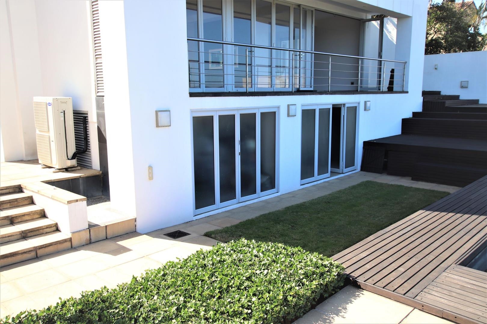 Hendra is delighted to present this fully furnished upmarket executive home for rent to a very discerning tenant.. This home offers spectacular golf course and sea views from almost every room in the house. Double volume entrance leads you into a fabulous living area with 2 spacious lounges, a very calming fish tank backing onto both the lounge and dining areas, all these rooms open up with stack doors onto the large covered deck for easy entertaining, the deck overlooks the rim flow pool, the golf course and the sea. The kitchen is modern and fully fitted with AEG appliances, gas and electric hob, double door fridge with water dispenser, Caesar stone tops and top quality cupboards, separate scullery area plumbed for appliances. Guest toilet downstairs.