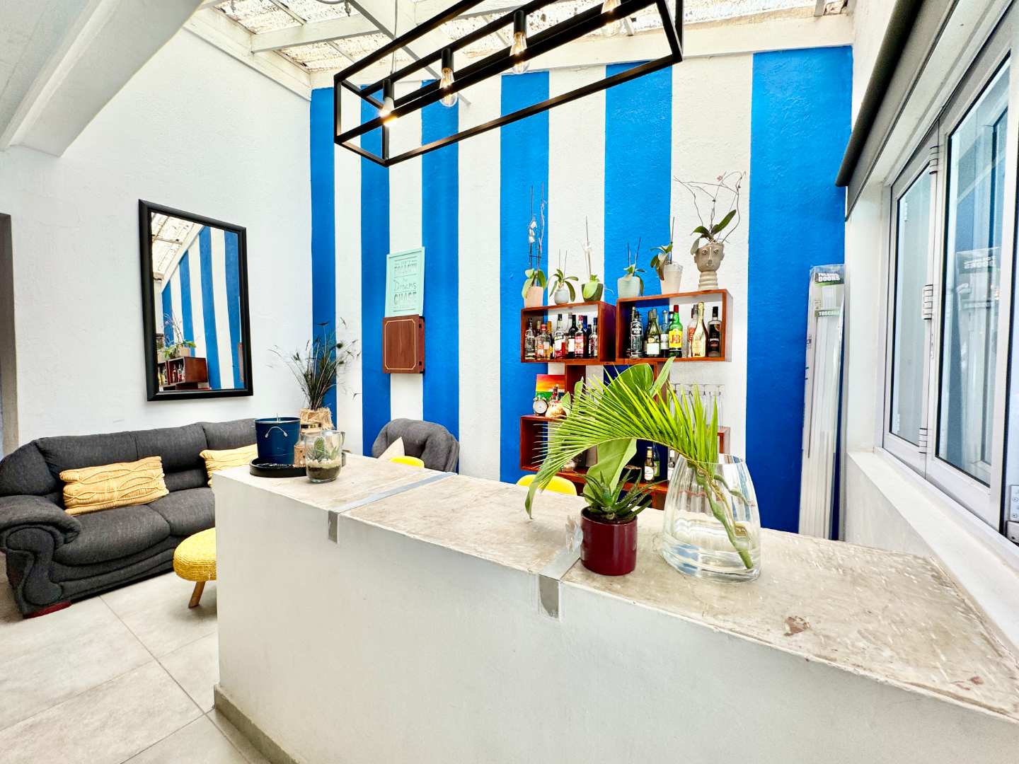 A cozy lounge area with a built-in bar creates a welcoming social space for relaxing with family or hosting friends. Large stackable aluminum doors open this area up to the outdoors, allowing natural light to flood the room while creating a seamless connection between indoor and outdoor living.