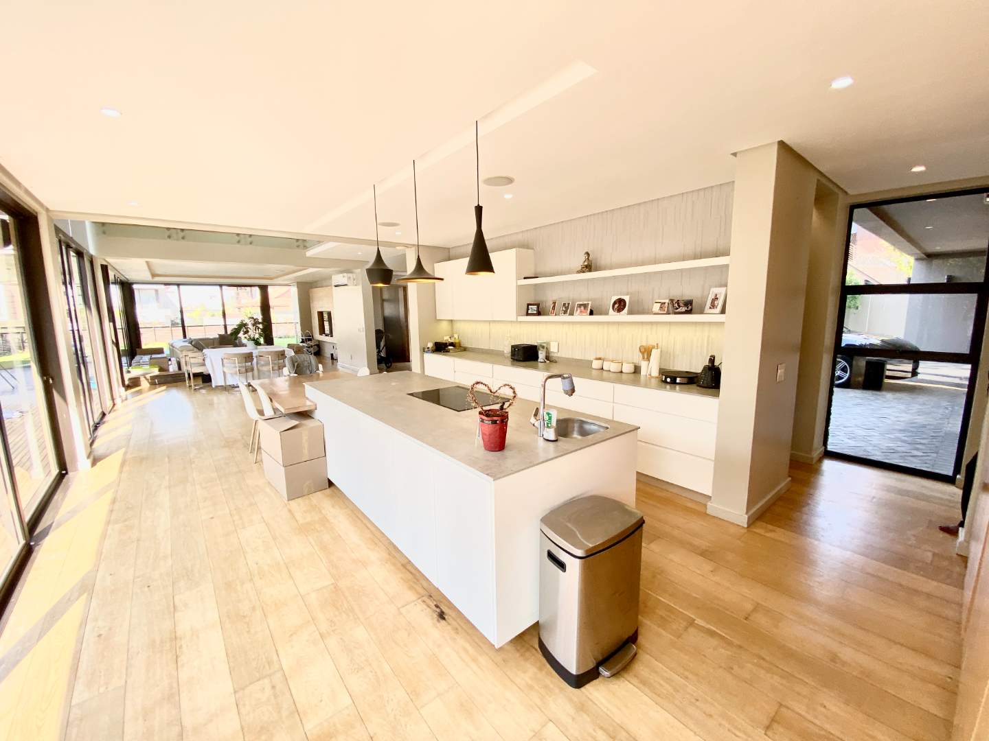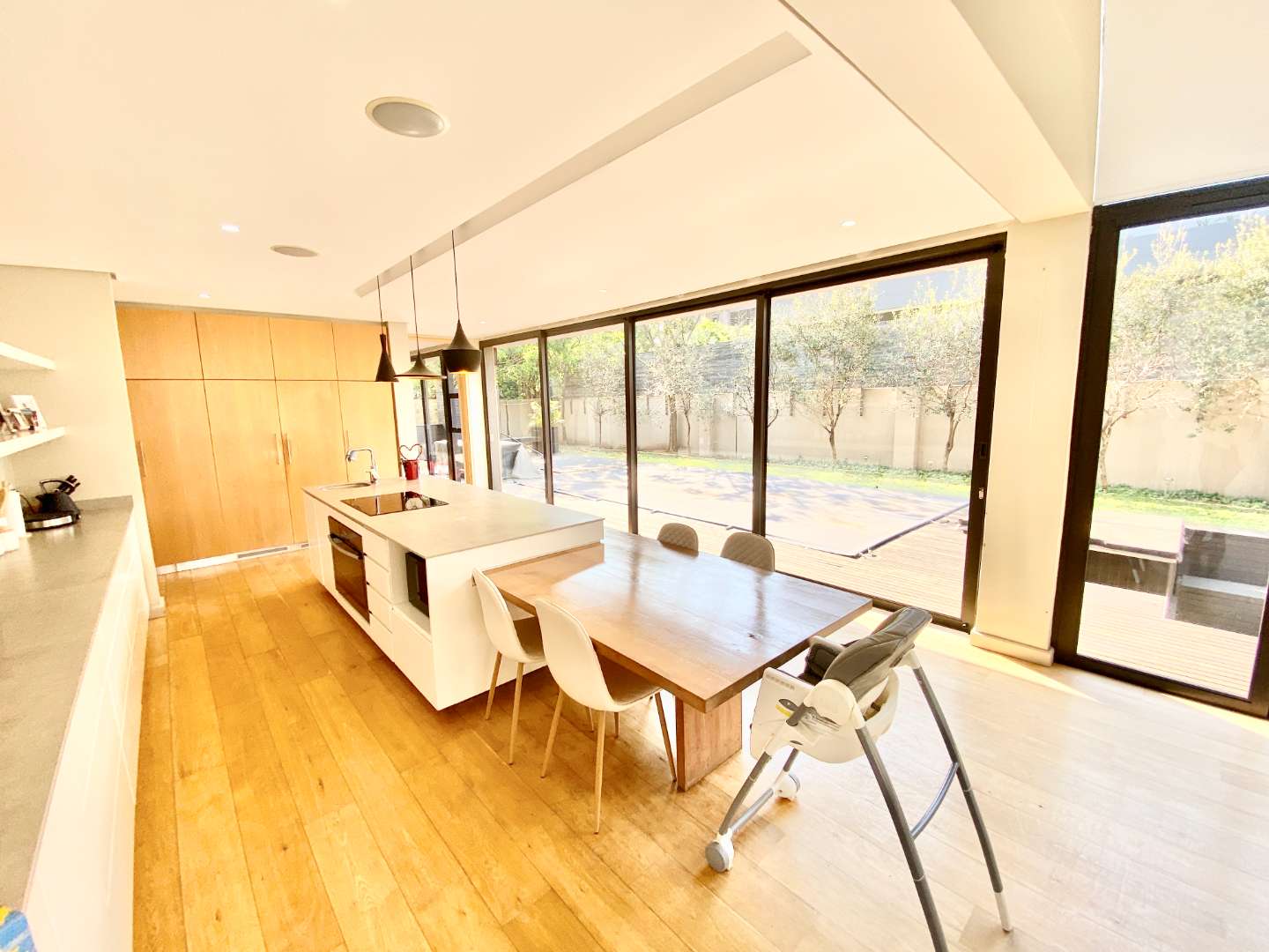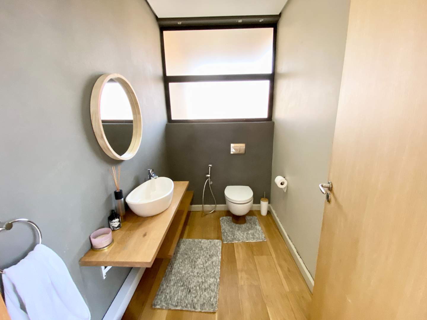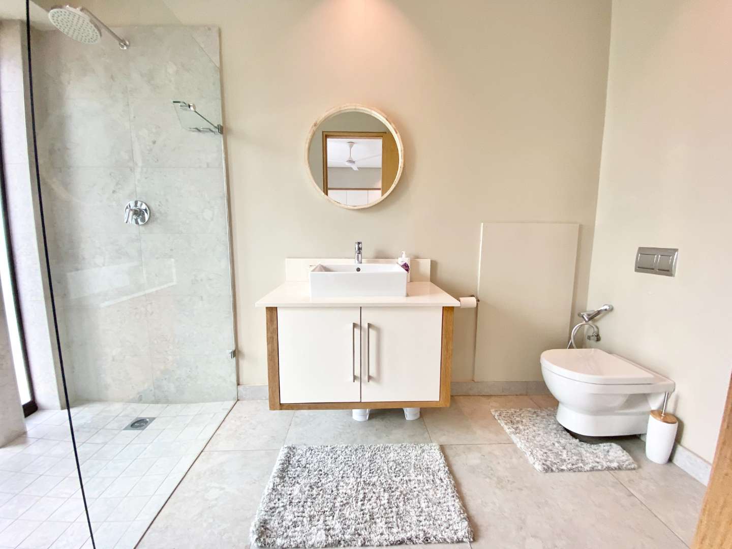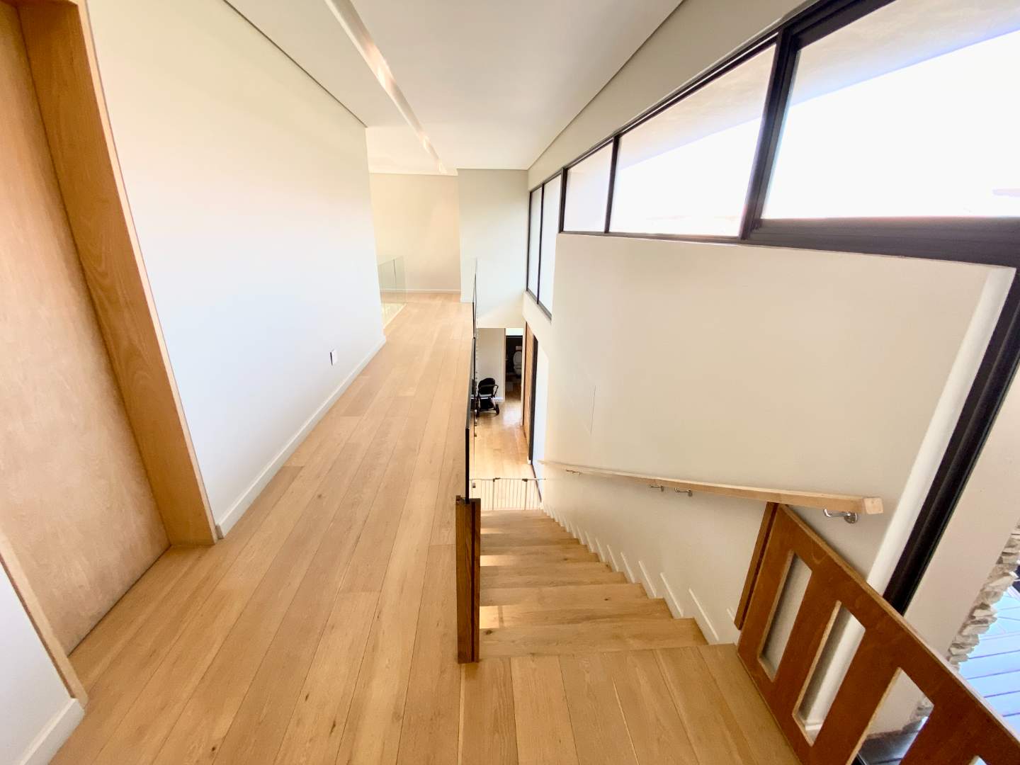 Downstairs consists of an en-suite guest bedroom, guest toilet and an open-plan living area with floor-to-ceiling windows which invite the outside in, casting a soft, natural glow across the whole room and kitchen area which posses a grand kitchen island offering ample counter and storage space in a minimalistic appearance, separate scullery and laundry area.