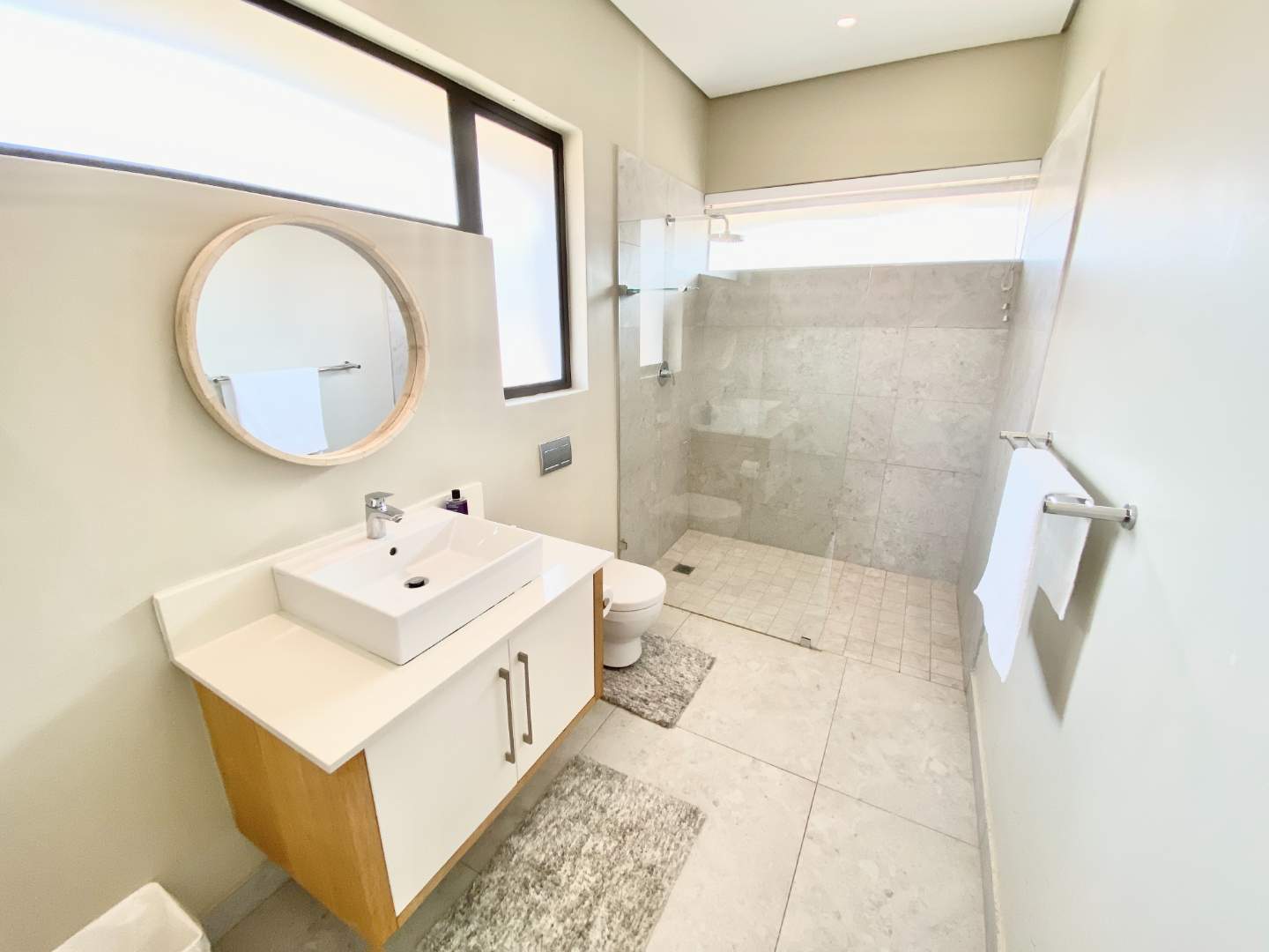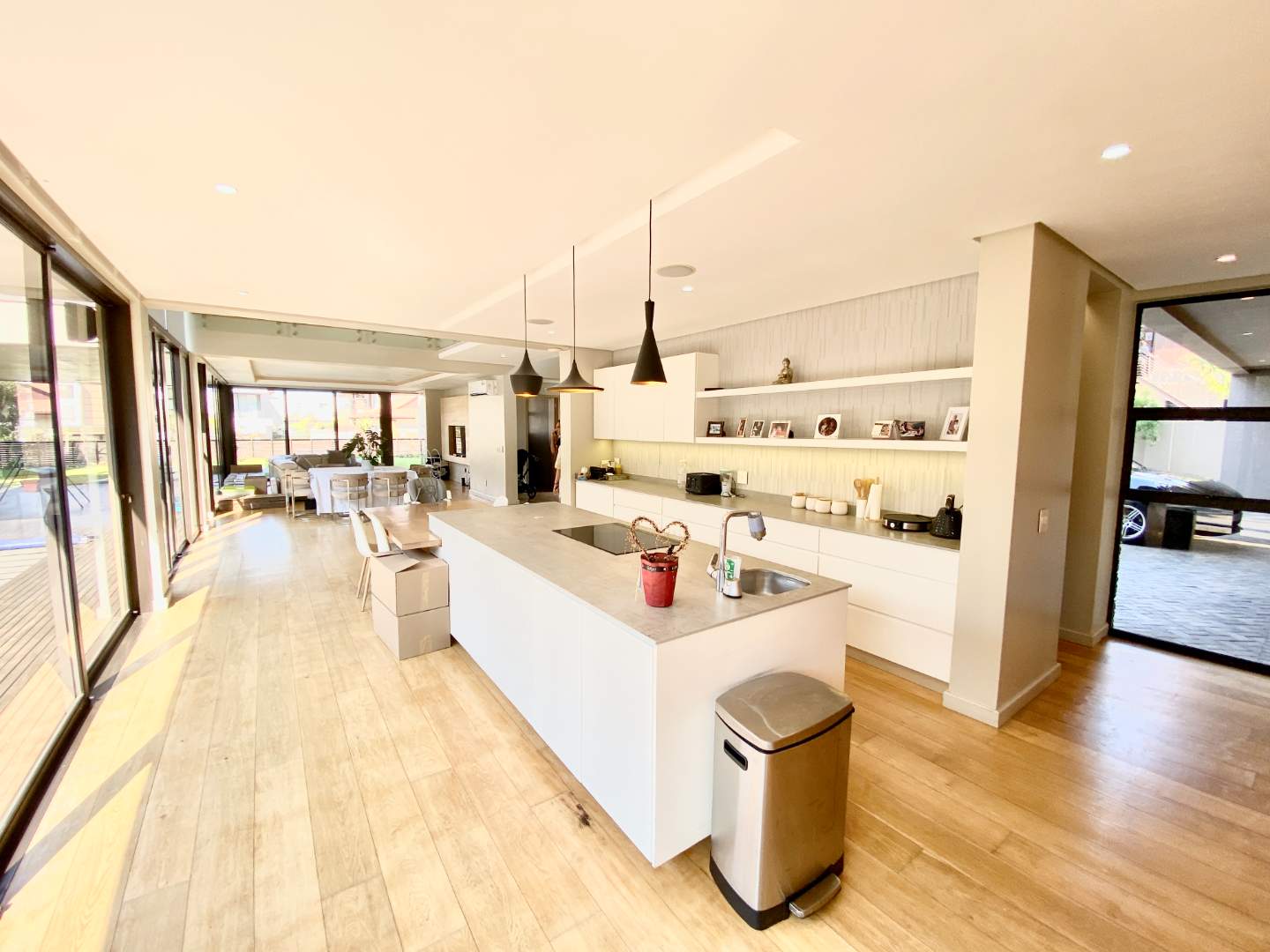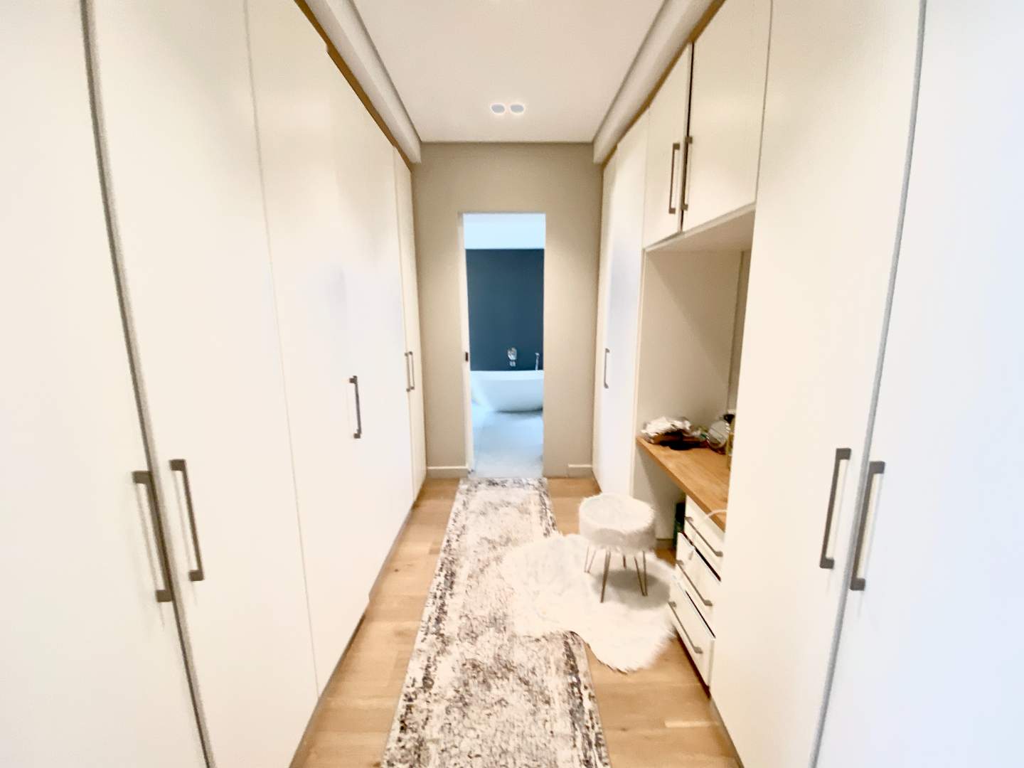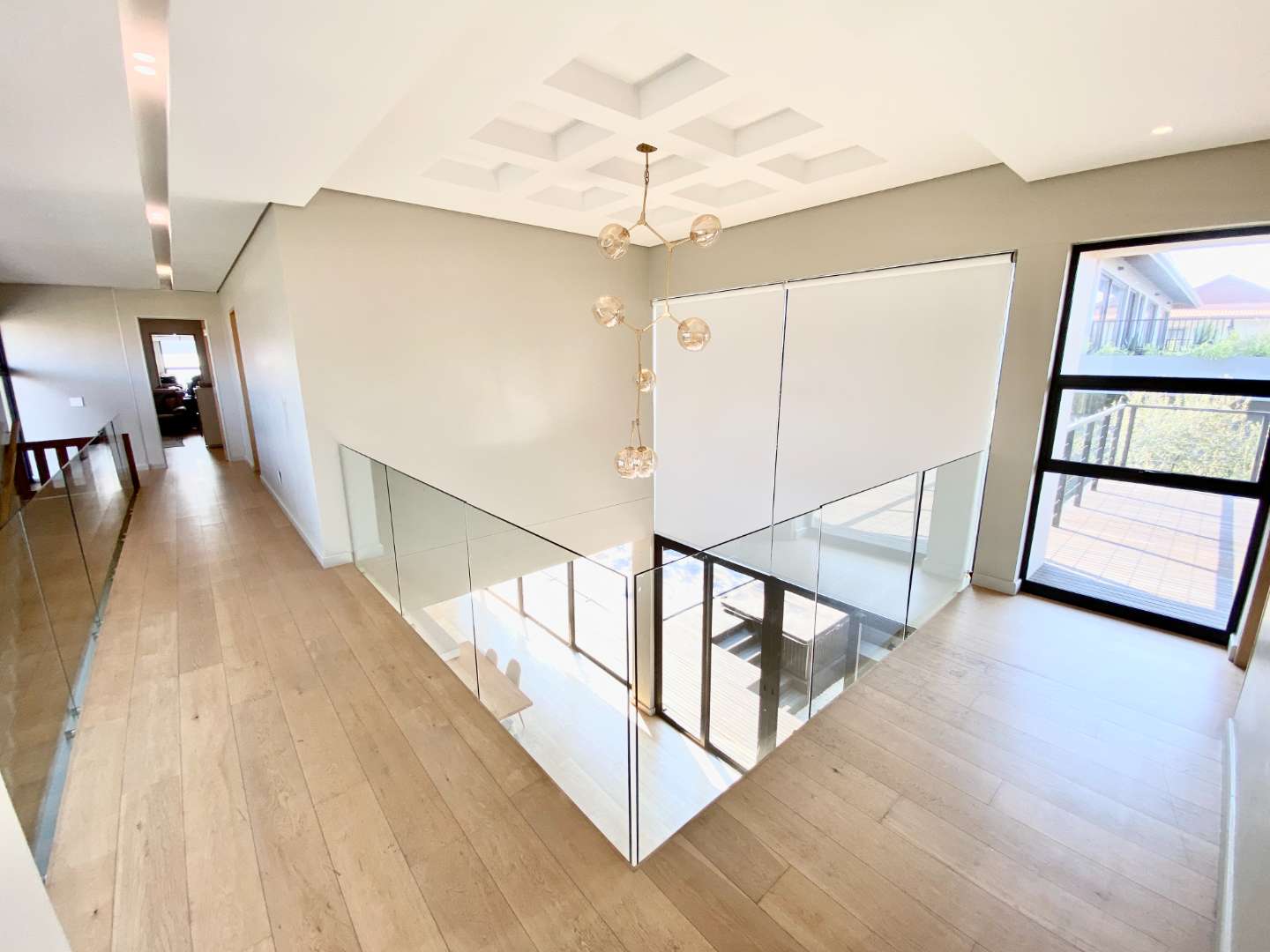 Downstairs consists of an en-suite guest bedroom, guest toilet and an open-plan living area with floor-to-ceiling windows which invite the outside in, casting a soft, natural glow across the whole room and kitchen area which posses a grand kitchen island offering ample counter and storage space in a minimalistic appearance, separate scullery and laundry area.