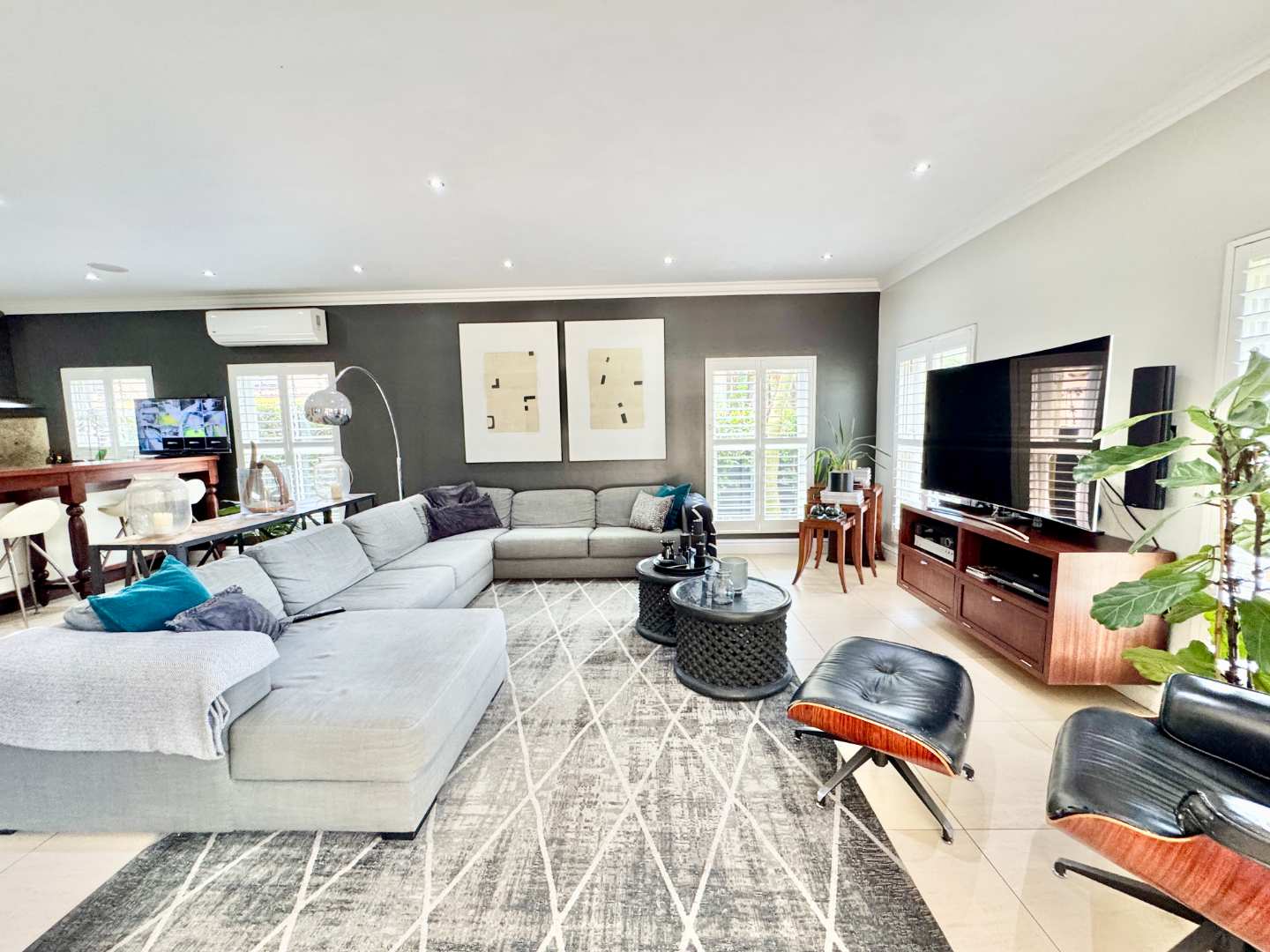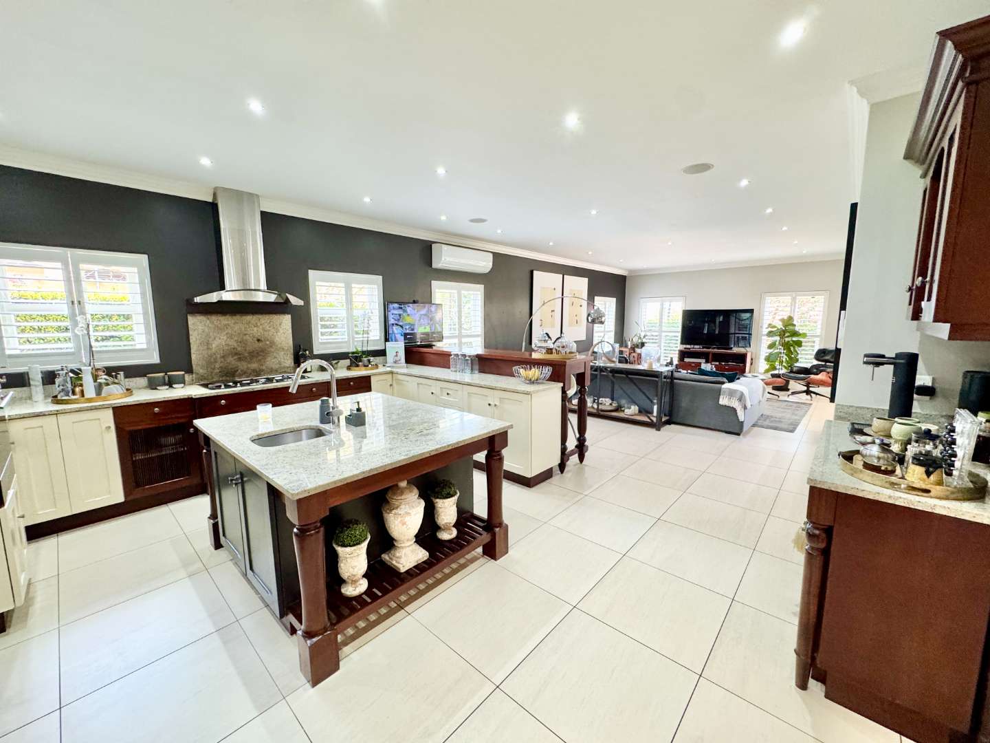 The open-plan design creates a harmonious flow between the lounge, dining area, and covered verandah — all enclosed with secure American shutters that enhance both privacy and safety while adding a touch of grandeur to this remarkable home.