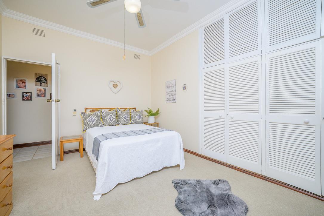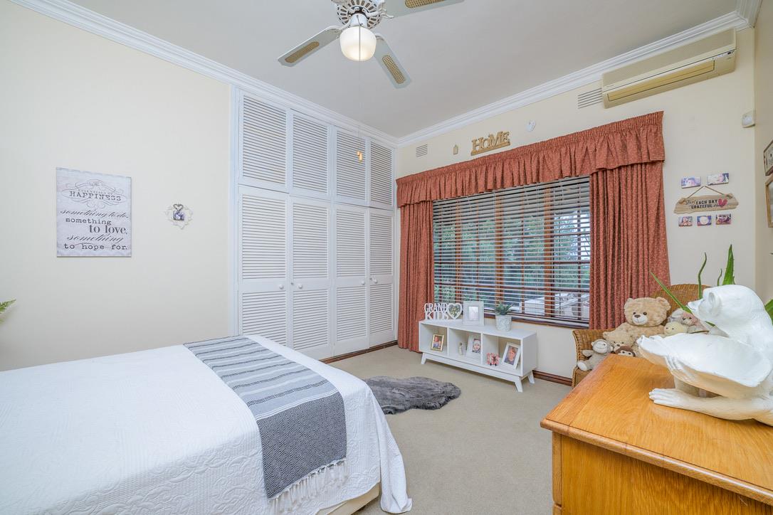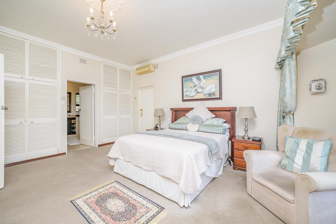 The main bedroom is generously sized and positioned to take advantage of the home’s elevation, featuring a full en-suite bathroom with dual basin, bath, and shower. The sunken walk-in closet adds both character and practicality, creating a well-defined private space.