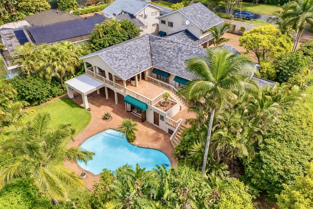 The outdoor space is centred around a well-maintained garden and pool area, offering both privacy and usability.