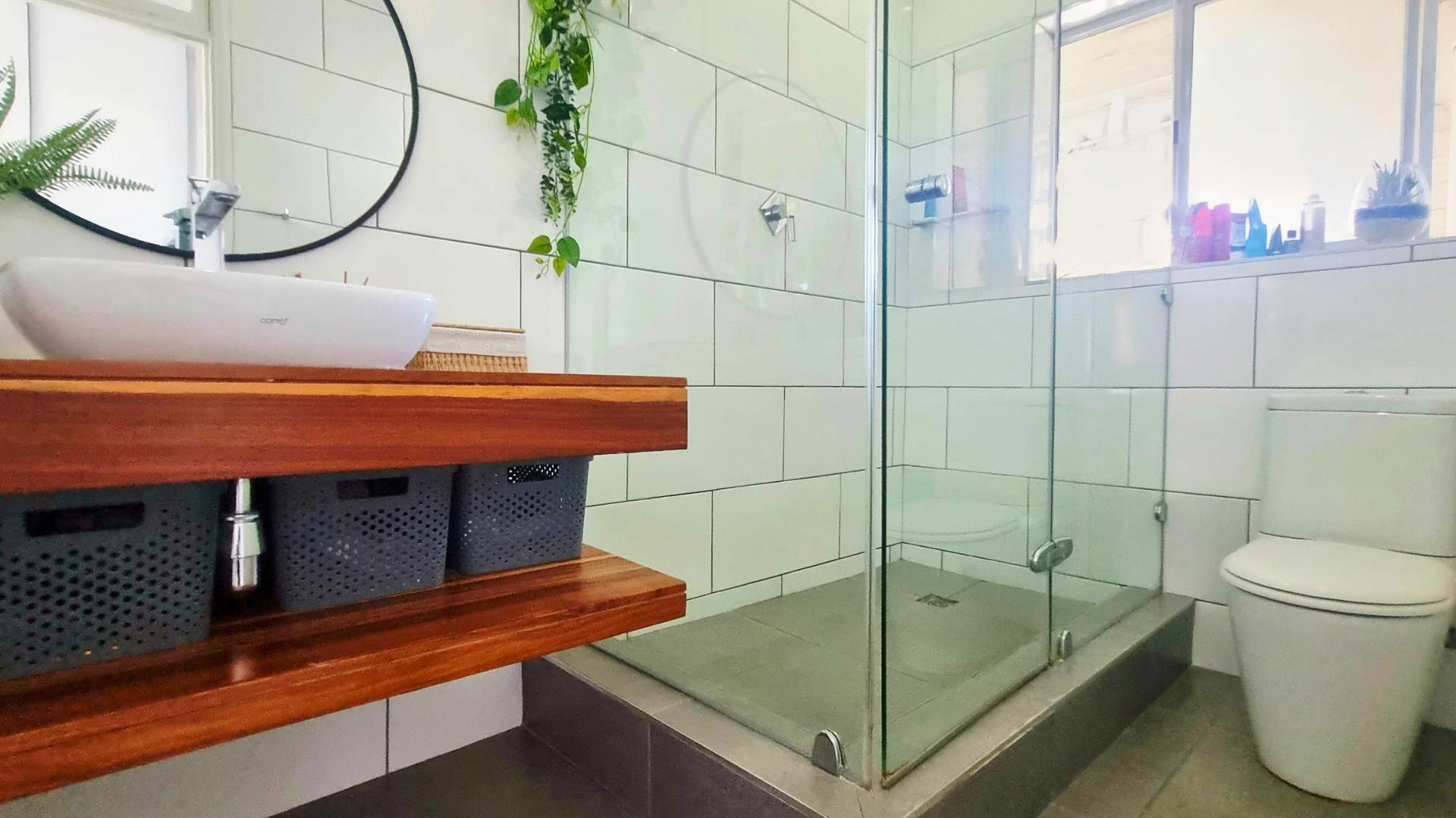 Upstairs, all three bedrooms are positioned together, giving the home a layout well suited to family living. The main bedroom includes built-in cupboards, air-conditioning, and an en-suite bathroom fitted with a basin, toilet, shower, and bath. Bedroom 2 also includes built-in cupboards, while bedroom 3 offers flexibility as a child’s room, guest room, or study. A family bathroom with a basin, shower, and toilet, together with a linen cupboard in the passage, adds further practicality.
