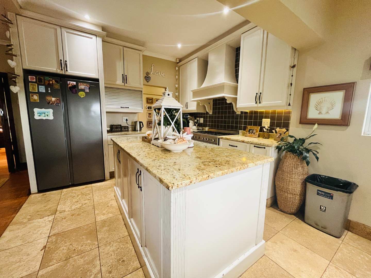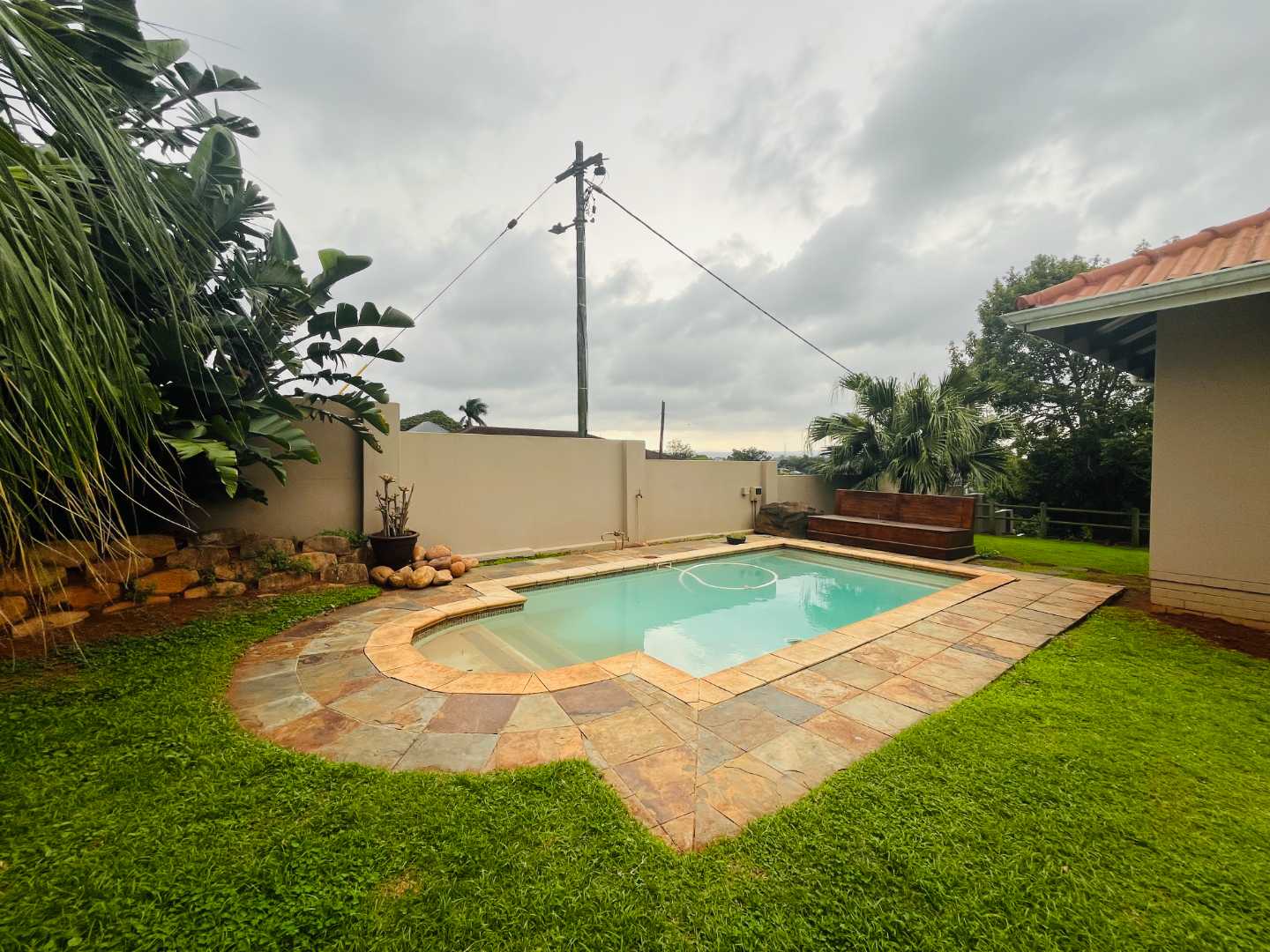 The modern kitchen features elegant granite countertops and a central island, creating a natural gathering point for family meals and entertaining. The open-plan living areas extend onto a covered patio overlooking a sparkling swimming pool and manicured garden – a perfect space for weekend braais and relaxed afternoons.