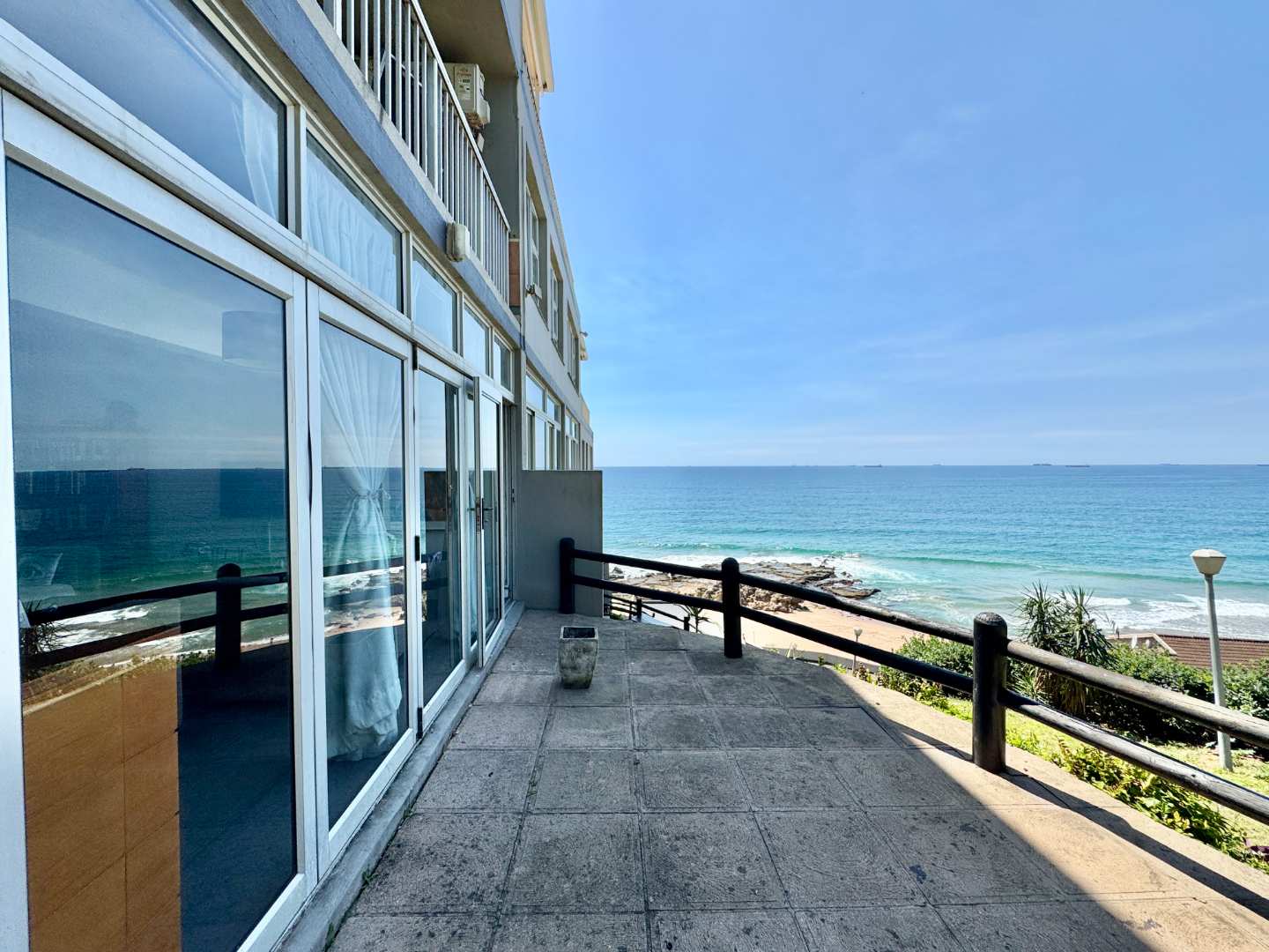 Enjoy air conditioning, screeded flooring throughout, and an open-plan living area and kitchen. The living space flows seamlessly through stack doors onto views that will take your breath away — uninterrupted ocean scenery stretching all the way to Durban Harbour.