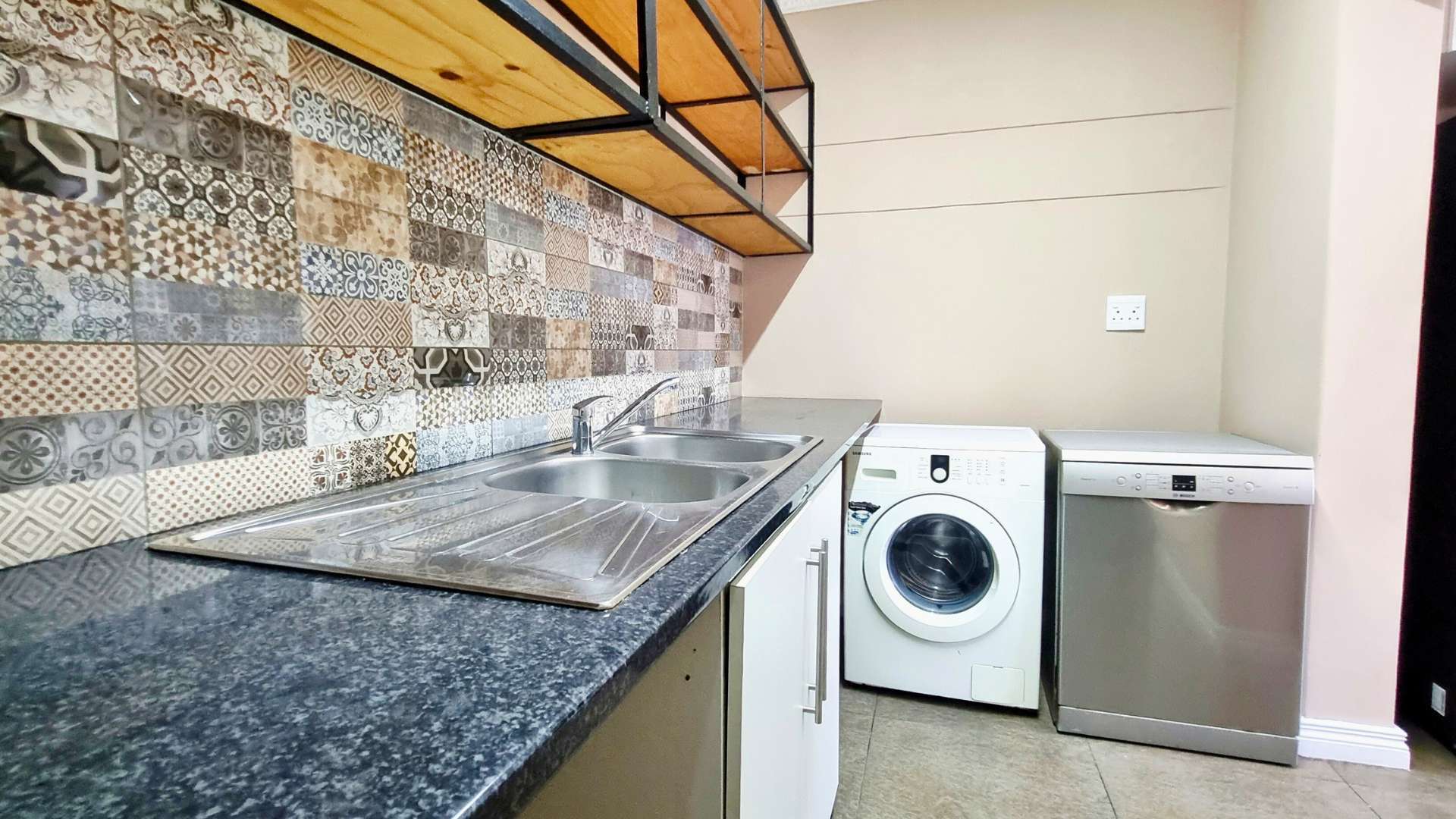 Scullery: 2 sinks, granite tops, wall shelving, appliance points (dishwasher / tumble dryer / washing machine)