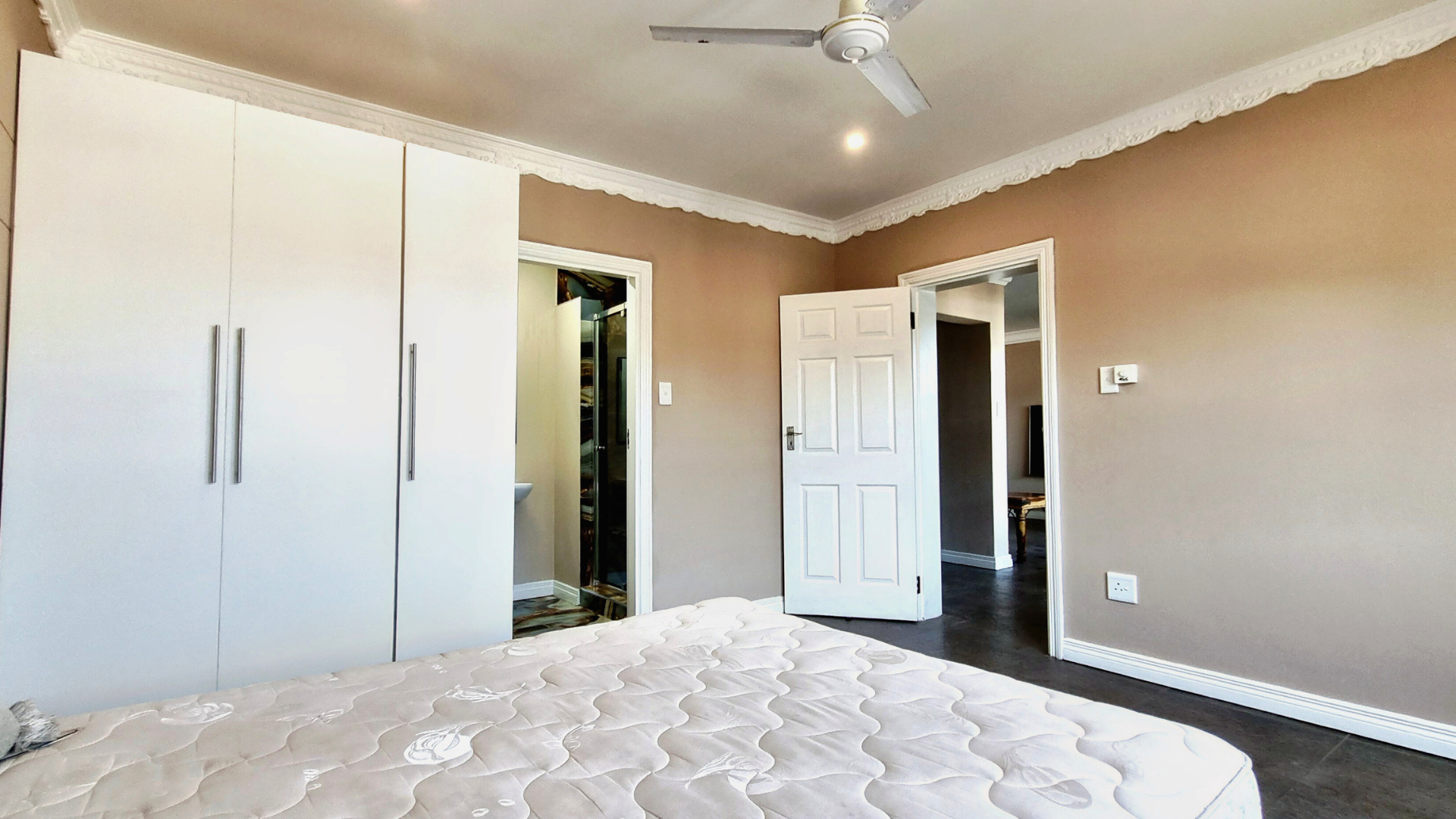 Bedroom 3: built-in cupboards, fan, balcony access + en-suite (shower)