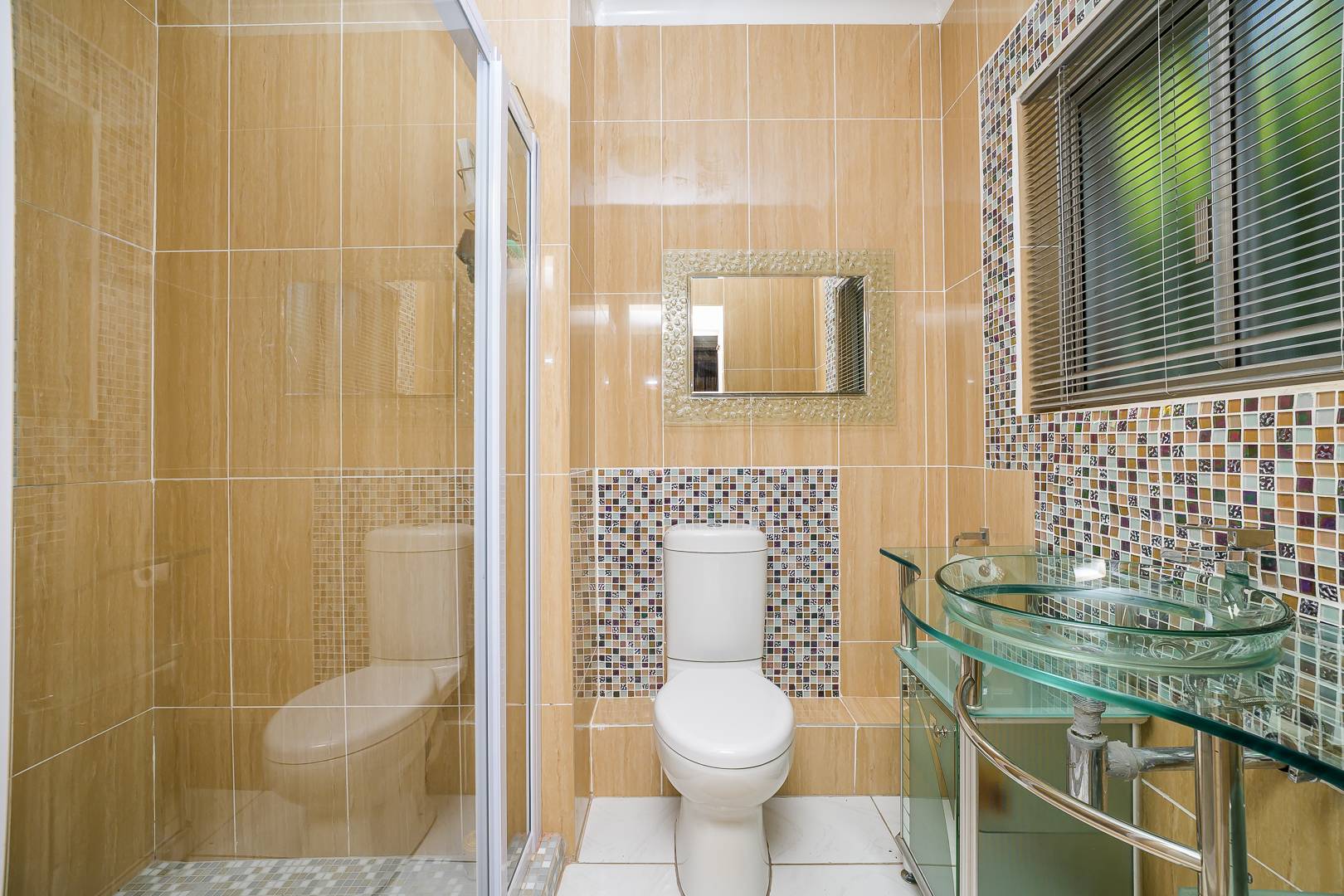 Leading off the main lounge are three well-appointed, air-conditioned bedrooms, each with access to the patio—including one with an en-suite bathroom for added convenience. An elegant family bathroom, with a substantial shower and Victorian bathtub, serves the other two bedrooms.