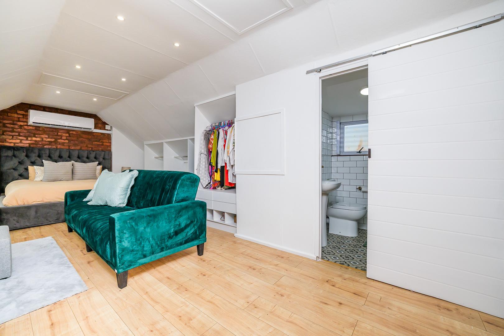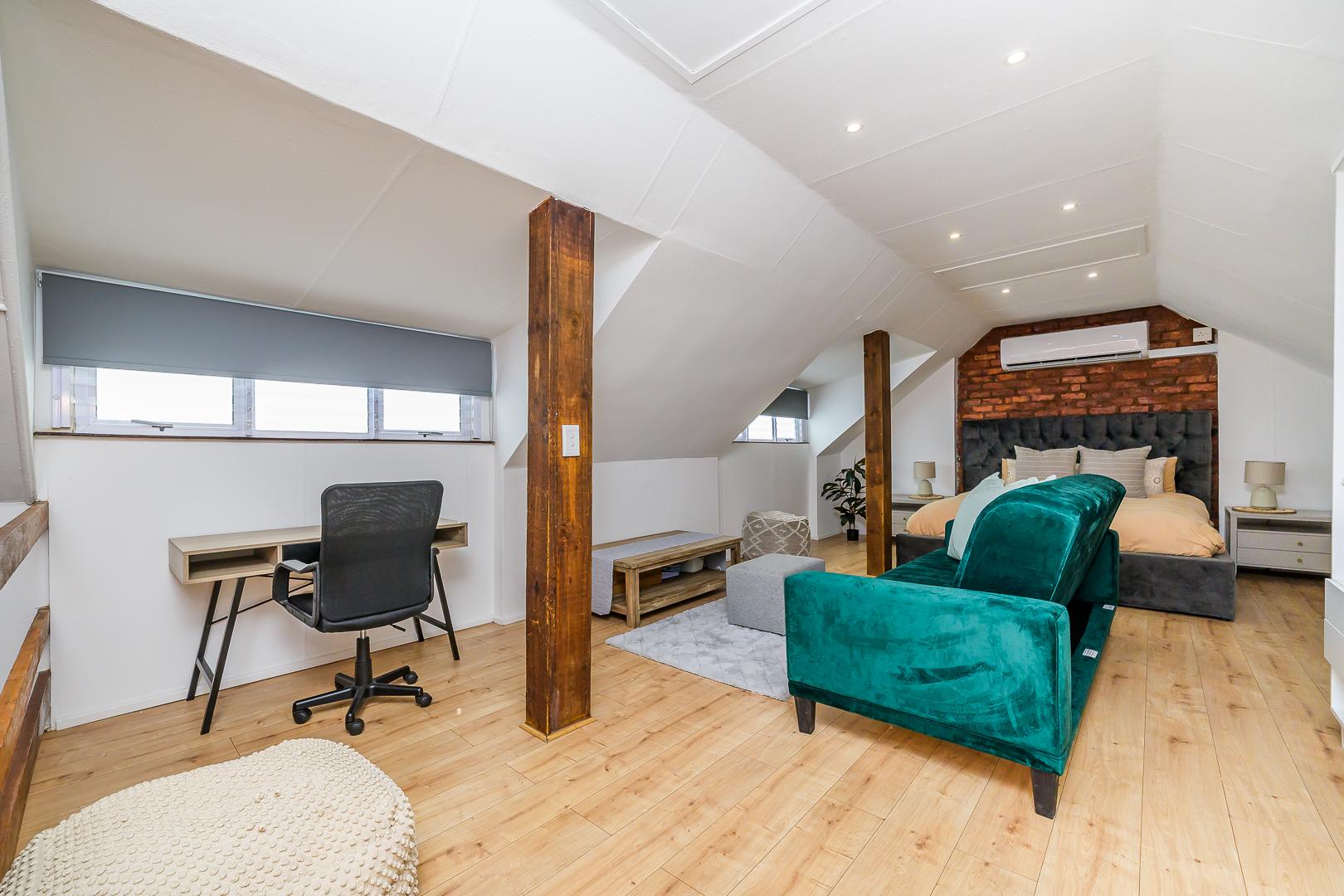 The loft-style upper level is dedicated to the spacious main bedroom, offering a private retreat within the home.