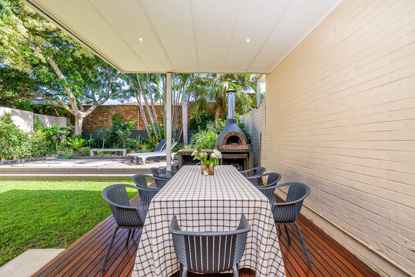 The large covered entertainment deck with high ceilings is ideal for hosting friends and family, complete with a built-in pizza oven perfect for relaxed evenings and weekend entertaining.