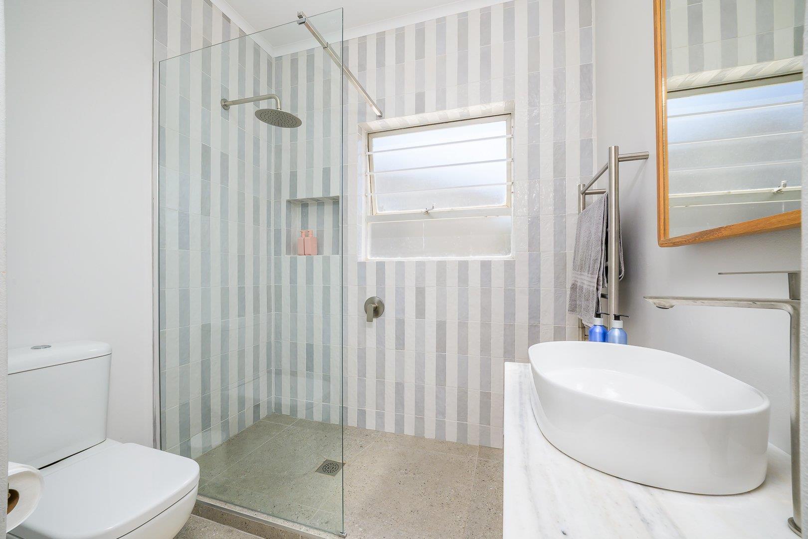 Shower, toilet, and basin.