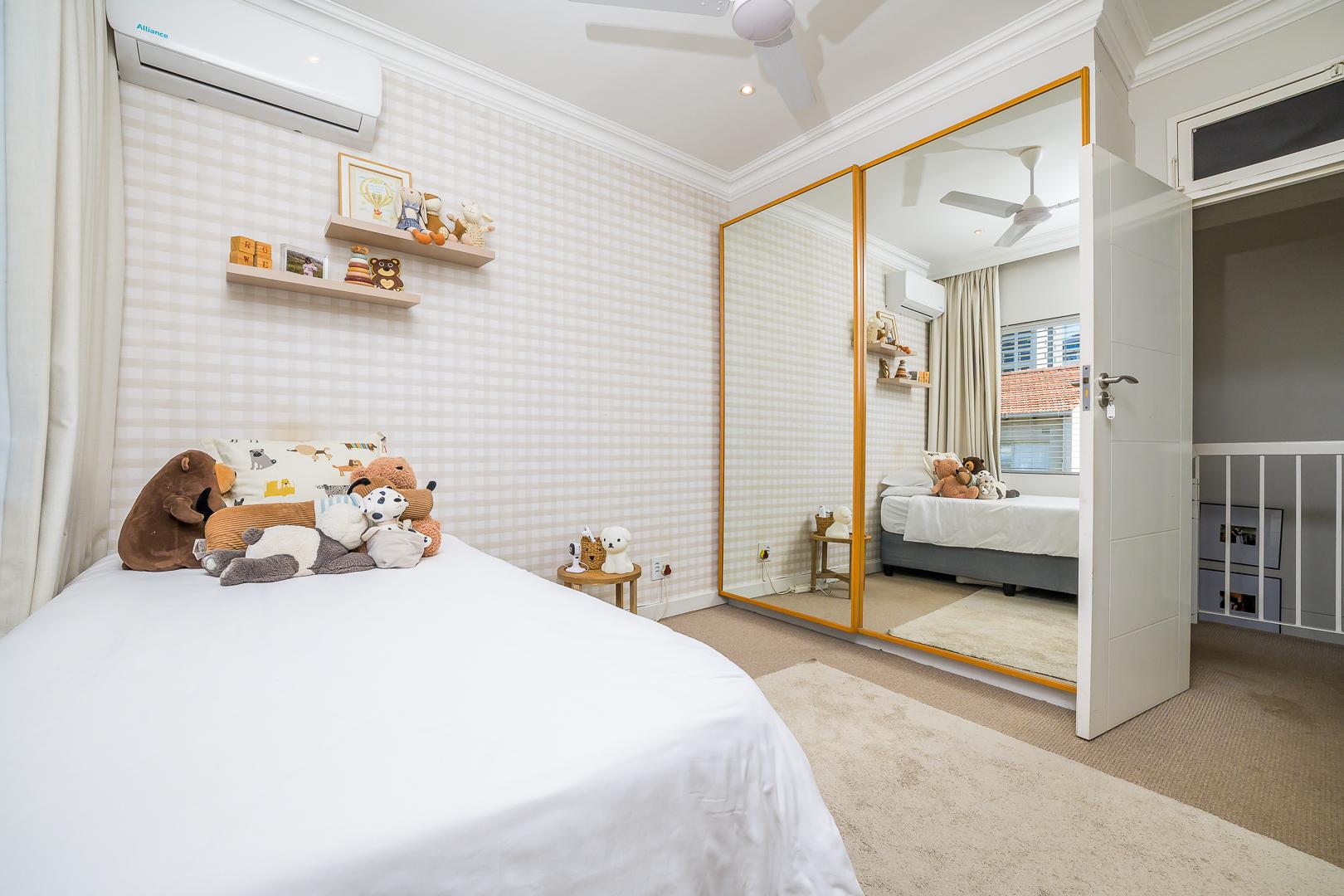 Spacious primary suite with air conditioning, ceiling fan, curtains and built-in cupboards with mirrored doors.
